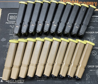 The 10 G17 mags I've been using in everything since 2017 are pretty worn out. Even with new springs and followers they're getting tired. I have at least 100 G17 mags so zero reason I shouldn't break out the set of poop brown mags I collected to be the 'next 10'. Baseplates are painted and numbered 0-9 and ready for class this weekend.