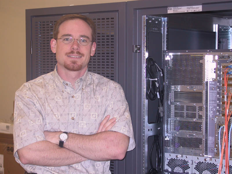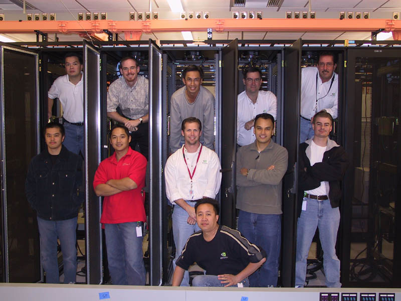 I wore real clothes again and lucky thing too, it was picture day. The VP wants pictures of everyone to put on the web page. Here are two (you can see one of my spiffy shirts). One is me trying to look awake by the V880s, the other is Ed's team stuck in the racks. In the team photo across the back left to right it's Dennis, me, Ed, Bill, Tom, then in the middle it's Jimmy, Charles, Rob, Rod, Rice Boy (Steve) and in front is Micheal. The Canadian is not in the photo, he's back in Canada on vacation.