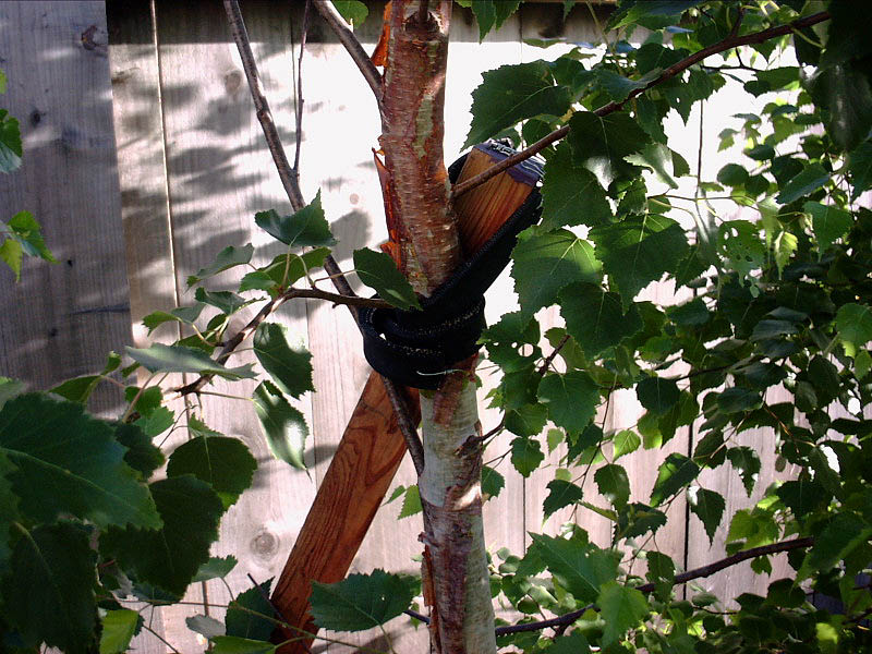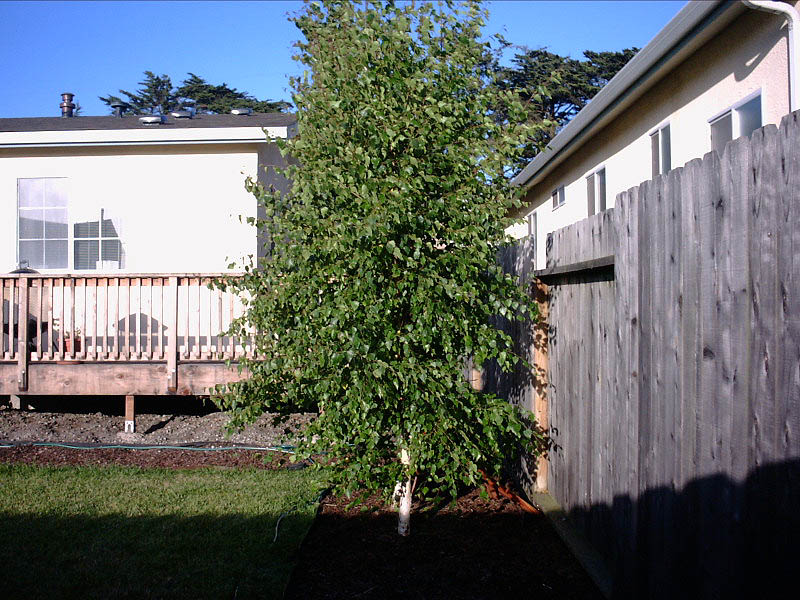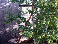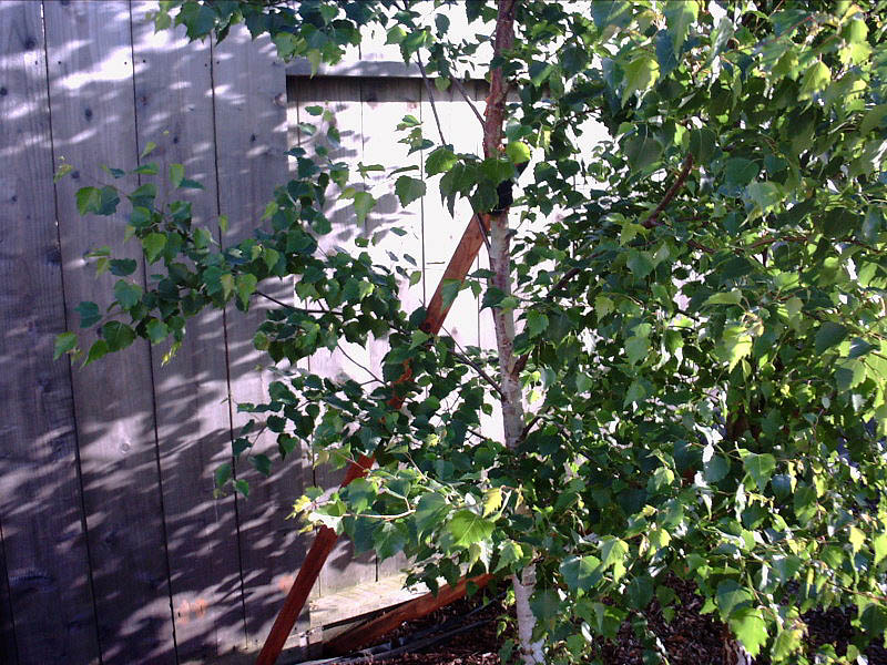 Sunday I had to repay the labor Kelly provided by helping her fix some trees that had blown over in the latest windstorm, put new latches on both gates, dig up a bunch of gopher mounds and put poison in them and then help paint her living room. So much for time off! I took some pictures of the trees, just in case anyone was interested in my handiwork. She had no tools, just a screwdriver and a small hammer so my idea of pounding the stakes in the ground 2' and tieing the trees to them was not possible. Putting them at an angle like that up against the fence works a lot better than you might think.